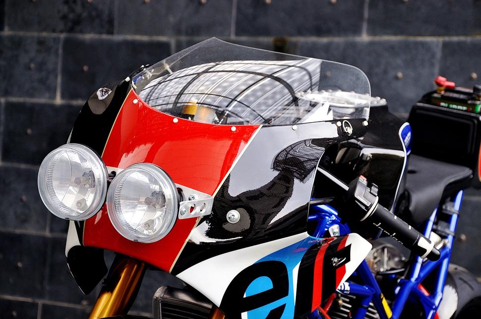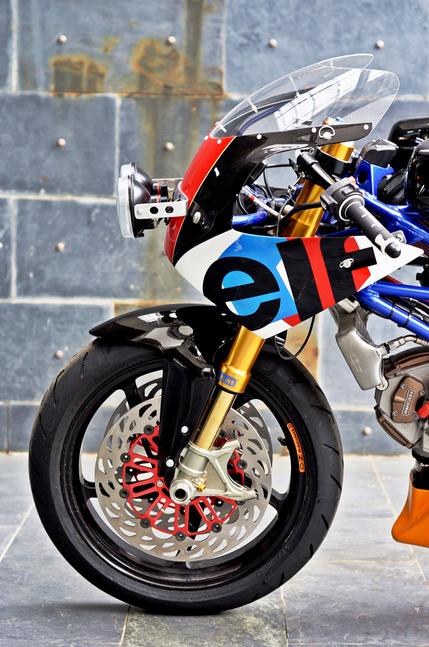 Затем двигатель был оснащён дорогими карбюраторами Keihin FCR 41, которые были куплены в США и оборудованы большими фильтрами K&N. Выхлоп - это сочетание выпускных патрубков Wolfman 2-в-1 и глушителя Spark Megaphone. Всё это позволило снять с колеса свыше 80лс при массе мотоцикла всего 152кг. Клиент хотел только лучшего, и хотя сначала речь шла о карбоновых колёсах, в итоге мотоцикл получил дорогущие кованые алюминиевые диски OZ Racing Piega.