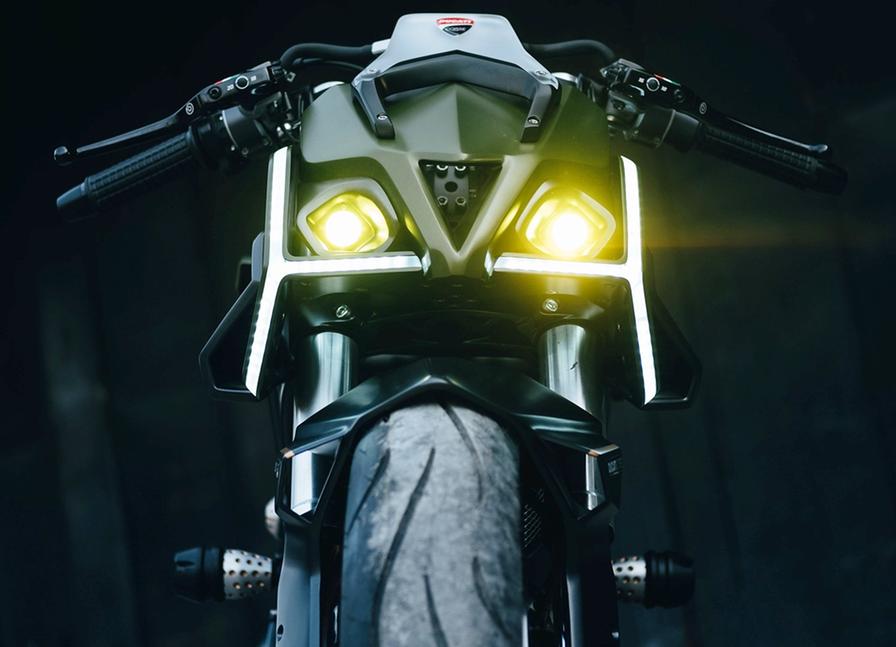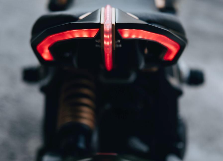 Ещё один невероятный аспект этого кастома - обрамляющая фары подсветка. Основная её часть была вручную изготовлена из акрила и подсвечена диодными лентами. Ветровичок сделан тем же способом, и философия “сделай, а не покупай” распространяется даже на задний тормозной резервуар, тщательно изготовленный вручную. Двигатель стал более бодрым благодаря открытым воздухозаборникам и выхлопной системе с задним глушителем HP Corse, а тормозная система собрана полностью на компонентах от Brembo.