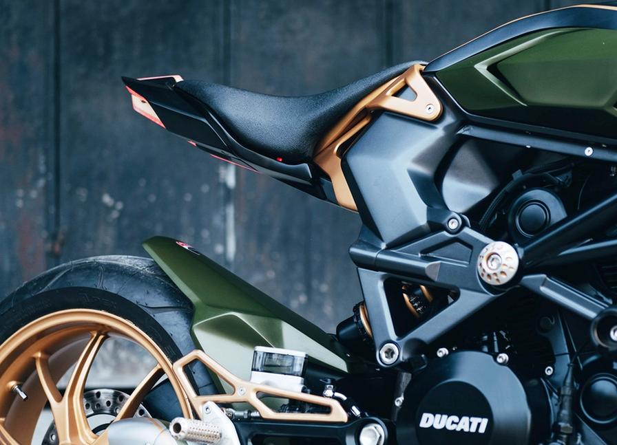 Мотоцикл Ducati Monster 796 раздели до рамы, убрали стоковый подрамник и решили, что визуальные элементы будут делаться в максимально гиперкаровом духе. Для этого нужно было создать что-то особенное, и вся задняя часть была изготовлена из единой легкосплавной заготовки на фрезере. Это была одна из самых сложных частей проекта: без высокотехнологичных 5-осевых станков, на которых работают крупные компании, качественная фрезеровка - дело крайне непростое. Но невероятный результат задал высоченную планку для всего остального обвеса.