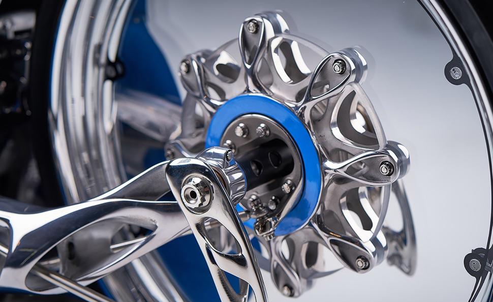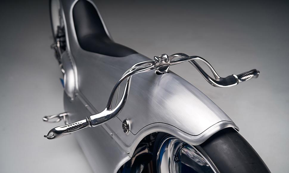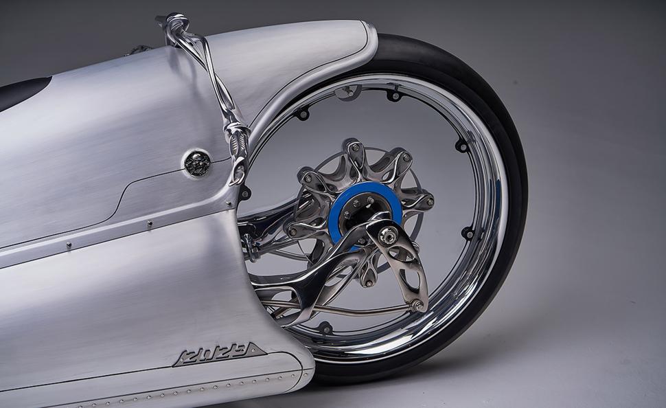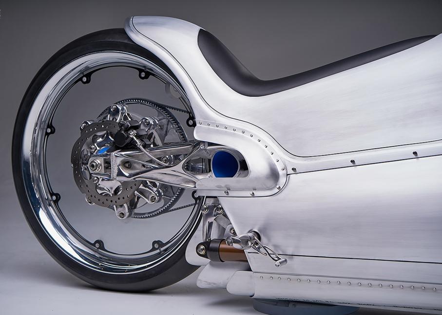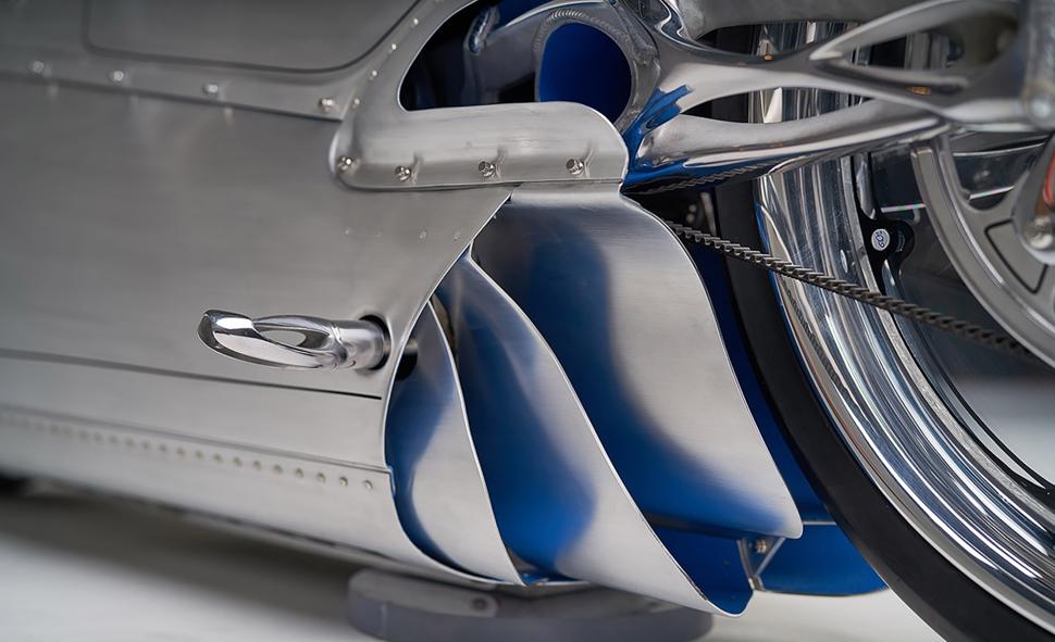 Мотоцикл целиком закрыт алюминиевым обтекателем, который очень похож на Majestic 1929 года. Сперва сделали контур обтекателя из 6-мм прутьев, сваренных друг с другом и прикрепленных болтами к алюминиевой раме. Затем покрыли все алюминиевым листом марки 3003-H14. Гребни вокруг областей крыла были вырезаны на станке MultiCam CNC WaterJet, который позволяет получить практически любую форму детали, и обработаны на станке Pullmax.