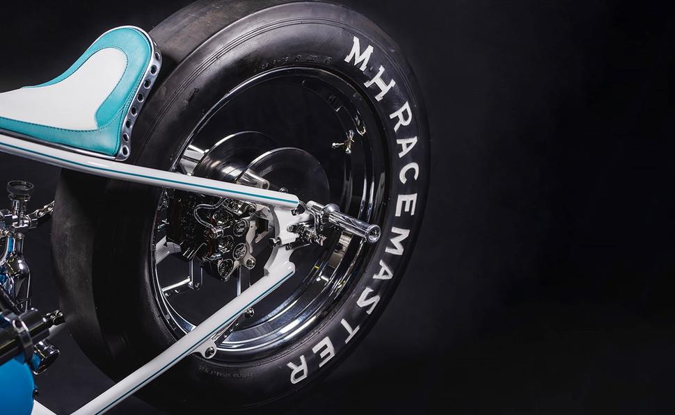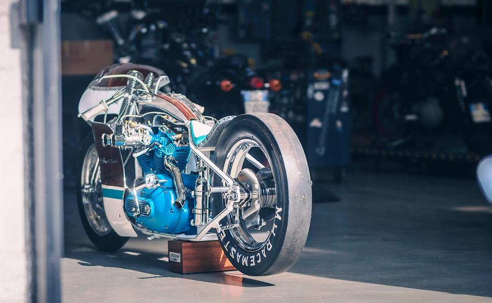 Общая компоновка получившегося Harley Davidson Sportster отражает самую яркую отличительную черту той лодки - её скорость. Маттео остановил свой выбор на силуэте дрэг-байка, начав с вытянутой сухой рамы ручной сборки. Укороченная афтермаркетная пружинная вилка-спрингер обнимает 18-е переднее колесо с барабанным тормозом от Laverda 750. Сзади гоночный слик MH Racemaster обут на сплошной 16-дюймовый колёсный диск. Внимательный взгляд обнаружит там дисковый тормоз, а совсем уж цепкий - ещё и водительские подножки мотоцикла.