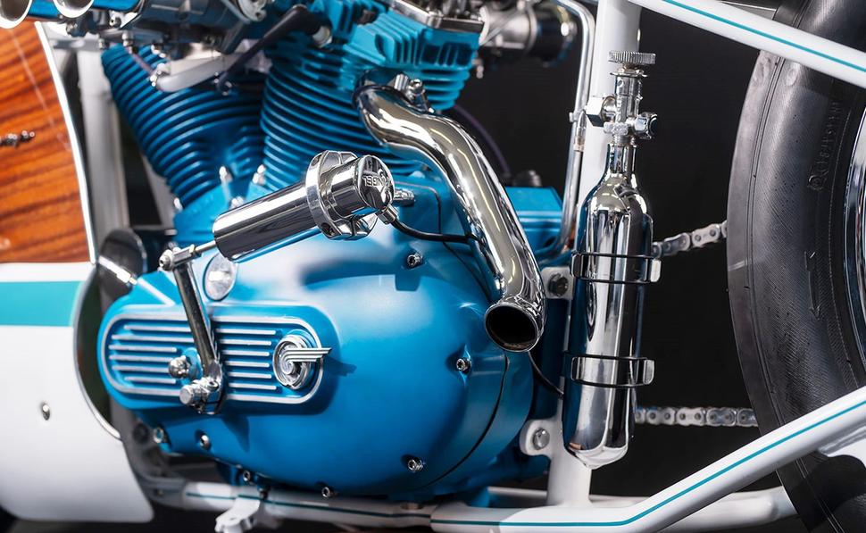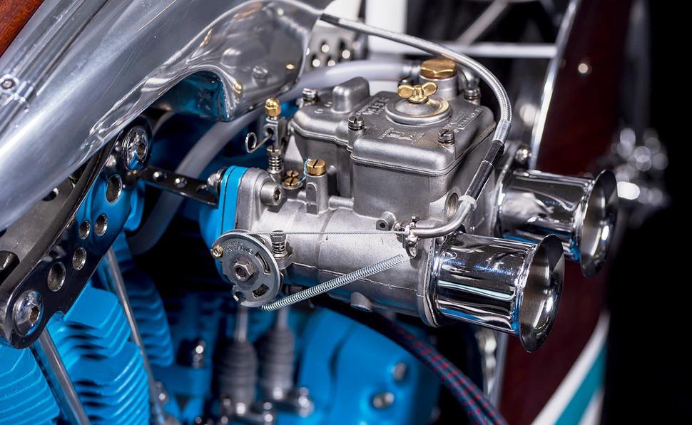 Для начала, он исхитрился развернуть передний цилиндр мотора Ironhead на 180 градусов. Зачем? Чтобы установить два карбюратора Weber, таких же, как в Lamborghini Aquarama. Двигатель Harley Davidson Sportster оснащён распредвалами Hot Cams, поршнями S&S Cycle и модифицированным магнето Morris. Ещё на нём стоит электрический шифтер Pingel, благодаря которому передачи теперь переключаются парой кнопок на руле. Выхлопные газы выходят через пару устрашающе коротких труб.
