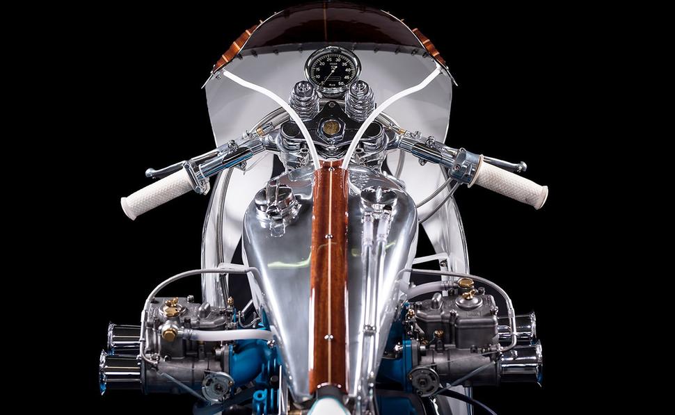На другом конце винтажные рычаги Tomaselli Matador установлены на клипоны, а одиночный тахометр Jaeger стоит по центру спереди. Но райдер, сидя (или лёжа) на этом мотоцикле, скорее всего будет глазеть не на тахометр, а на необычный дизайн бензобака этого великолепного мотоцикла.