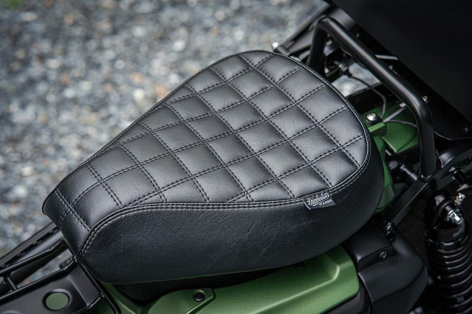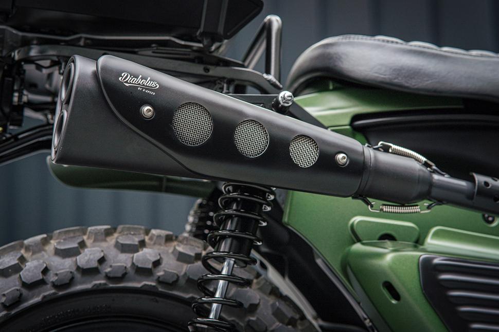 Сюда можно прикрепить небольшой спальник, а что-нибудь покрупнее удобнее перевозить сзади. Там имеется целая багажная система с боковыми креплениями и, конечно же, большим центральным кофром от BM-Motor, который можно снять при поездках по городу. Но вообще с таким внешним видом мотоцикл так и напрашивается на путешествия по бездору, и чёрно-зелёная матовая расцветка только подчёркивает суровый внедорожный вид. Сиденье, обшитое качественной чёрной кожей - это ещё один каталожный товар от принадлежащего K-Speed бренда Diabolus.
