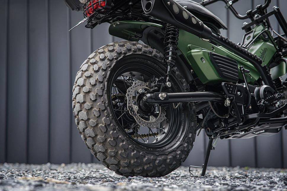 Стоковый CT125 ездит на 17-х шинах с размером 80/90, но Ик хотел чего-то сильно большего. Теперь спереди стоит кастомное 17-е колесо, окрашенное в чёрный и обутое в зубастую резину 100/100 от Champion. А сзади всё ещё суровее - там колесо тоже спроектировали специально под проект, но для того, чтобы поставить ещё более пухлую резину, его сделали 14-м и обули в 180/80-14 от Vee Rubber. Видок получился вполне вездеходный, в духе TW200, но для того, чтобы задний бублик встал на место, пришлось серьёзно переделать маятник.