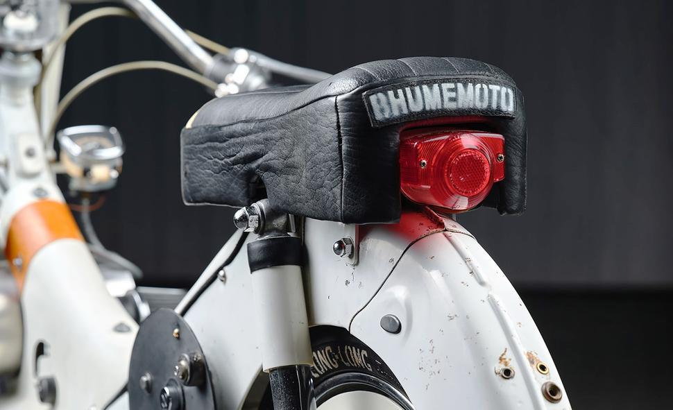 Для седла Bhumemoto сделали небольшую основу и в её торец встроили родной задний фонарь от Super Cub. Под стать количеству патины на оригинальных запчастях скутера седло обшили лоскутной кожей "под старину", так что издали оно выглядит изрядно потрёпанным.