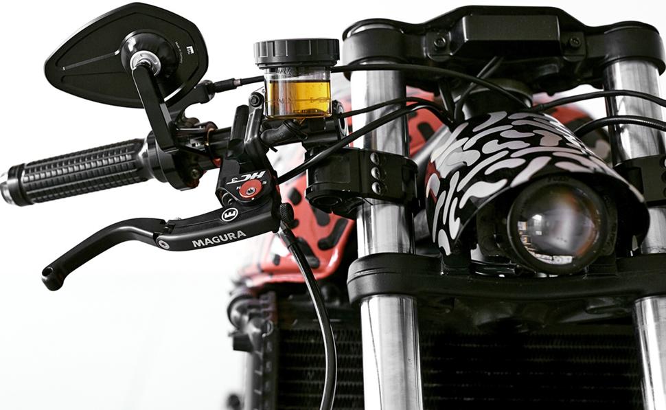 Перейдём к эргономике мотоцикла: Impuls установили новые подножки, лапки управления и клипоны, а также несколько элементов от Motogadget, включая грипсы, поворотники и новые небьющиеся зеркала. Также на мотоцикле установлена новая гладкая верхняя траверса со встроенным спидометром Motogadget и полоской индикаторных лампочек.
