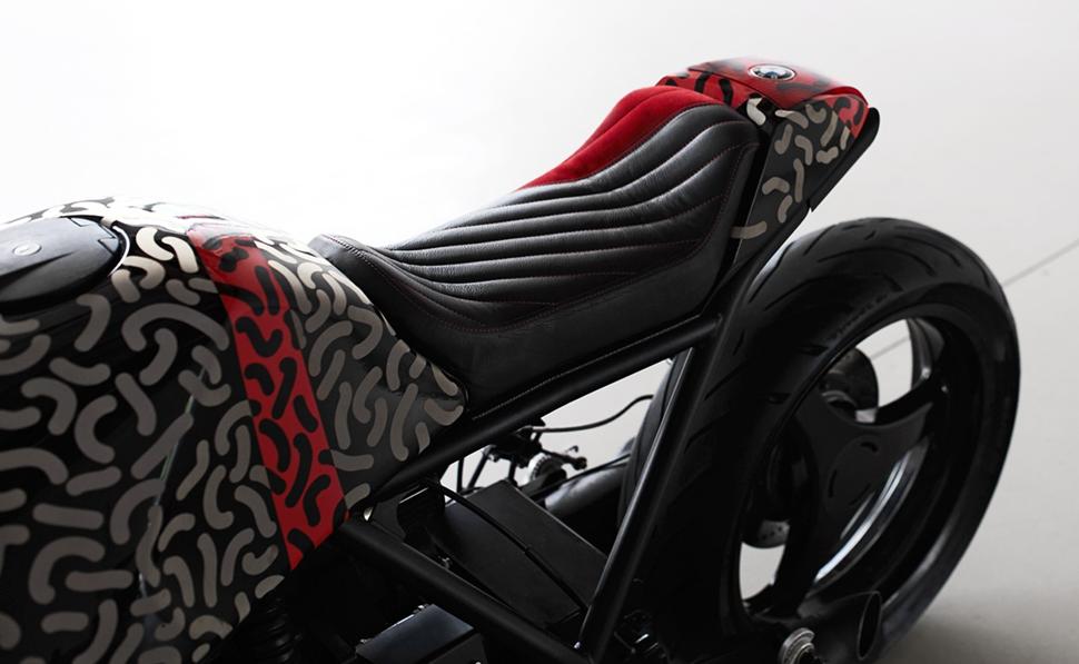 Доминик Джонс из Leatherworx обшил сиденье, использовав чёрную кожу, красную алькантару и контрастную отстрочку. Также он установил в седло гелевые вставки, добавившие комфорта.