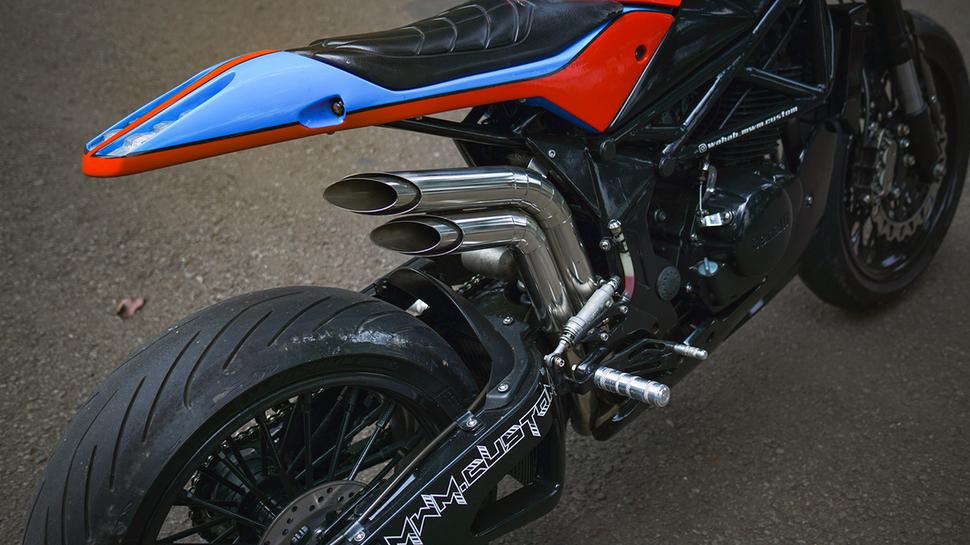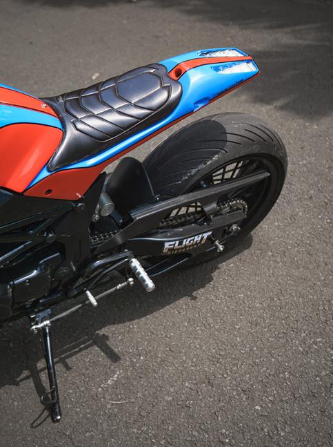 Рама, конечно, претерпела множество модификаций, как для того, чтобы на неё встала удивительная капотировка, так и чтобы подготовить её к следующему этапу. А следующим этапом была вообще непостижимая техномагия: парни пересадили на маленького итальянца весь зад от Yamaha R1. Да, это было отчасти китчем: ребята хотели продемонстрировать свои потрясающие навыки, ведь такая химера потребовала серьёзной сварки и усиления места установки шарнира модифицированного маятника. Продолжает спортбайковую тему амортизатор от R1, тоже пересаженный на кастом при помощи нового верхнего крепления.