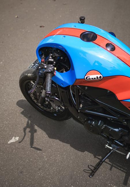 Откидная крышка бензобака и встроенный заподлицо цифровой спидометр только добавили сложностей, а маленькая фара только подчёркивает размер фиберглассового обтекателя. Нижняя часть облицовки и колёсные крылья были окрашены в простой чёрный, а самые радикальные элементы обвеса с гордостью носят гоночные цвета Gulf Racing. Не менее радикально выглядит выхлопной тракт: выпускной патрубок ныряет под облицовку, а затем выныривает сзади, оканчиваясь совершенно дикими срезанными наискось трубами, несомненно орущими на открытом газу.