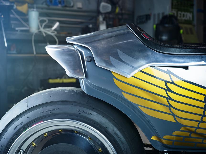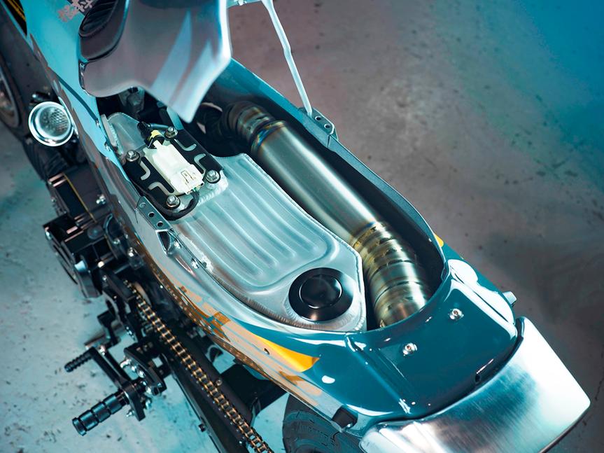 Выхлоп - тоже полностью их творение: выпускной патрубок и труба изготовлены из титана. Проходит он изнутри кастомного обвеса, а затем появляется сзади в виде алюминиевого наконечника глушителя, выступающего в роли хвоста мотоцикла. Для того, чтобы сделать всё это, понадобилось проделать огромную работу по переделке стоковой стальной рамы: проделать отверстия для выхлопа, вырезы для обзора на пневмоцилиндр, а затем придать стальному обвесу такую форму, чтобы он плотно охватывал заднее колесо.