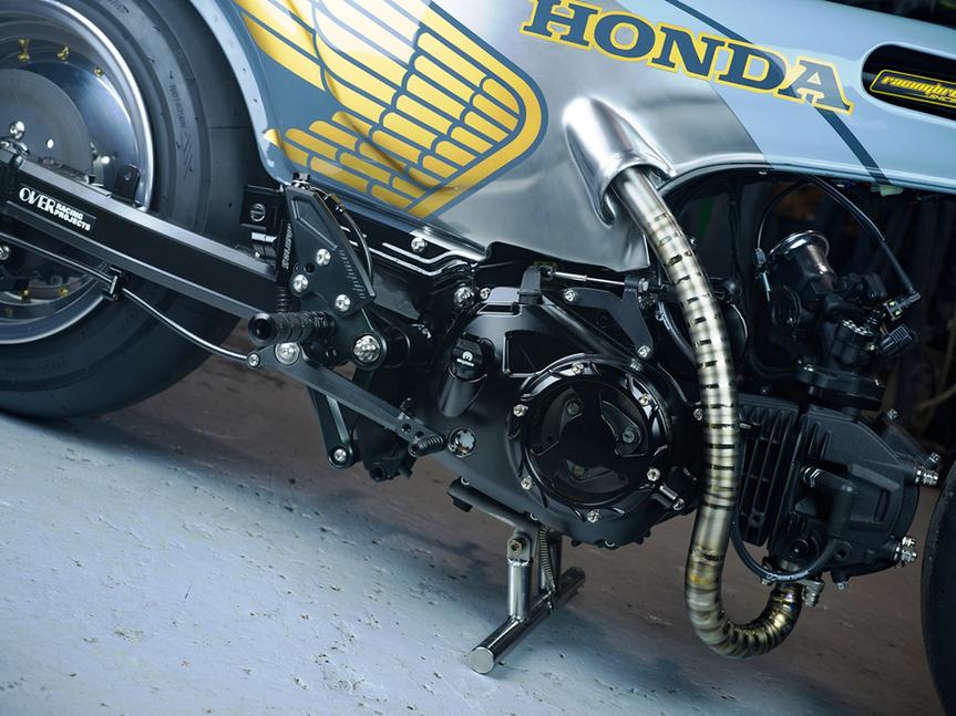 Чтобы поставить мотоцикл на ход, ребятам были нужны подходящие колёса. Они остановились на 12-дюймовых наборных колёсах от Monkey Kit. Лёгкие алюминиевые диски обуты в слики, причём задний диск шириной 150мм обут в 120-ю шину в типично японском стиле. Дальше команда сосредоточилась на выбранном двигателе - это, кстати, был 125-кубовый мотор от Honda Grom. У него те же габариты, что и у мотора Dax, но полностью мануальная трансмиссия. Ребята даже решили оснастить его гидравлическим сцеплением, установив второй главный цилиндр на клипонах. Маленький и яростный двигатель был немного доработан, например, получил кастомные крышки, прозрачную крышку сцепления и широкую впускную воронку производства Jzo.