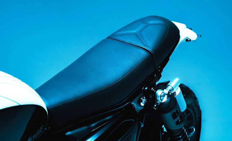 На фото сиденье изображено в двух разных вариантах обивки, но главное тут в том, что его пассажирская часть отстёгивается и открывает алюминиевую багажную рамку. Под ней находится напечатанная на 3D-принтере основа, создающая эффект продолжения заднего крыла. Эта деталь вдохновлена задними крыльями на классических Дакаровских раллийных мотоциклах.