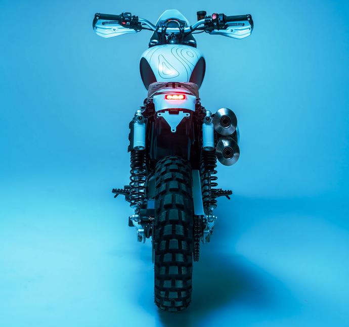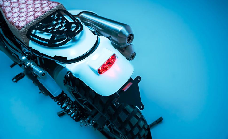 Сзади мотоцикл красуется узким крылом со встроенным диодным задним фонарём. Crooked разработали его вместе с Йенсом фон Брауком из JVB-Moto, у которого имеется большой опыт создания подобных деталей. Опять же, серийная версия хвоста оснащена более крупными поворотниками производства Crooked, а не теми, что показаны на этих фото.