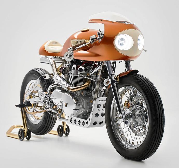 Вот этот кафе-рейсер начинал свою жизнь в виде самого обыкновенного карбового Thruxton-а, но потом команда Tamarit Motorcycles приложила к нему руки. Испанская команда хорошо разбирается в воздушных Triumph, ведь через мастерскую их прошло около 120 штук. В работе над этим проектом Tamarit использовали компоненты ручной работы, шикарную окраску и немного греческой мифологии. Итак, знакомьтесь: Helios.