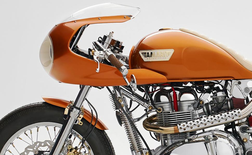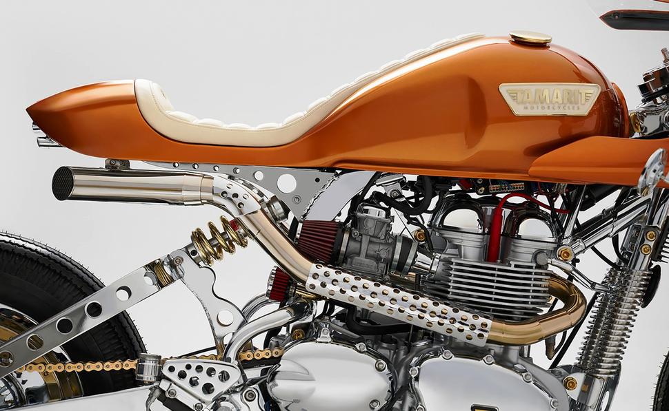 Эти воздушные Bonneville-вские моторы мощнее, чем кажутся. Пара продуманных модов позволяют их как следует взбодрить, и именно так поступили Tamarit. Они полностью перебрали двигатель, а затем настроили карбюраторы Keihin под работу с капсульными фильтрами K&N.