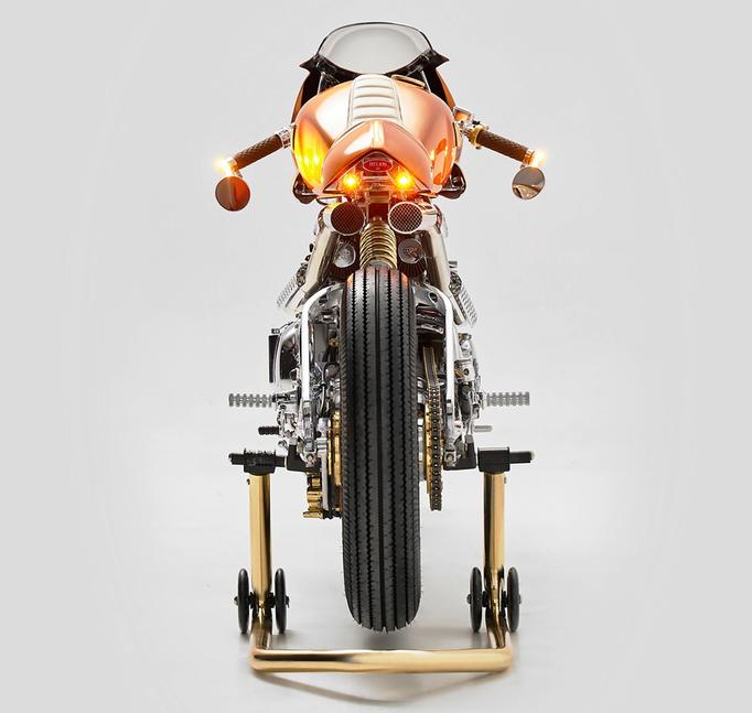 Штатные колёса от Triumph Thruxton (18-е переднее и 17-е заднее) обуты в классическую "пильчатую" резину от Victory. На заднем колесе красуется симпатичная заглушка с золотой отделкой, изготовленная специально для этого проекта.