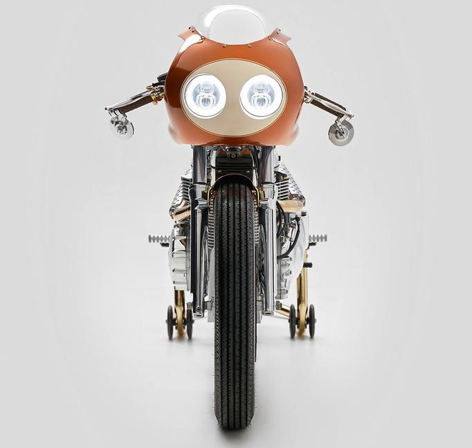 Седло обшито кремовой простроченной кожей, которая заходит на бак, добавляя тонкий штрих к силуэту мотоцикла. Кастомный передний обтекатель оснащён двумя круглыми фарами, искусно утопленными под общим кожухом, что придаёт кастому нужную нотку мотоциклов для гонок на выносливость. Область головного света была окрашена в кремовый цвет под стать сиденью - ещё один чрезвычайно стильный штрих.