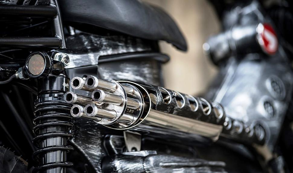 Самой броской частью этого маленького Honda Cub является выхлоп в стиле пулемёта Гатлинга. Он полностью функционален и вращается тем быстрее, чем быстрее едет Cub. Такая штука любому вменяемому человеку показалась бы мерзкой на каком-нибудь чоппере, а на маленьком Hunter Cub она оказалась неожиданно уместной.
