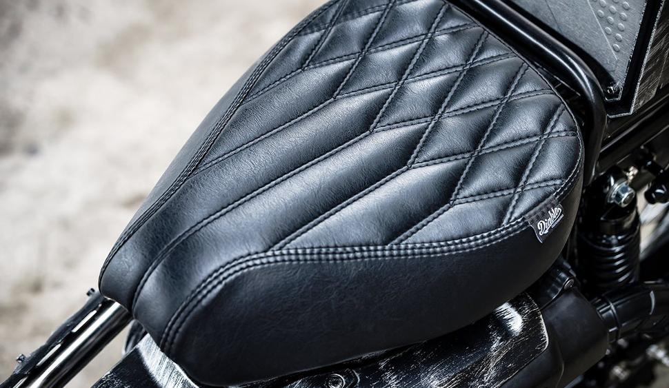 Затем было разделано и переобшито сиденье - в классическое сочетание диагональной и плиссированной обшивки. Кроме этого сзади установлена новая защита цепи, а также диодные задний фонарь и поворотники из каталога K-Speed.