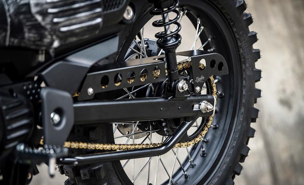 Начали K-Speed со снятия стокового маятника Honda Cub и замены его на кастомный на 5 см длиннее. Это позволило им увеличить заднюю резину - вместо штатной Cub-овской 80/90-17 они поставили эндурную 100/100-17.