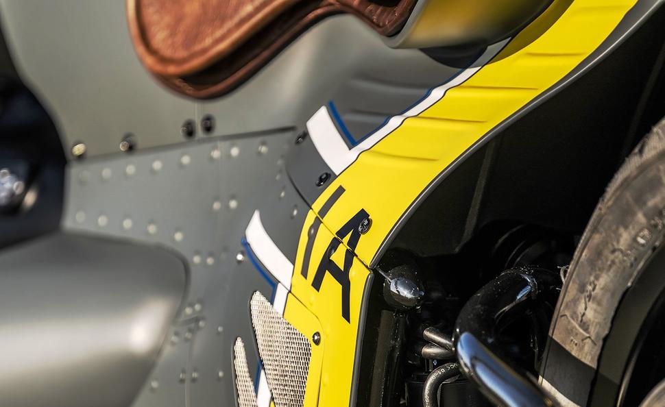 Алюминиевые панели по бокам мотоцикла сшиты болтами с полукруглой головкой, издали похожими на заклёпки. Вентиляционные окошки зашиты металлической сеткой, а боковые "воздухозаборники" позади цилиндров на самом деле закрывают впускные тракты. Обшивка сужается к задней части и переходит в аккуратный тонкий хвост, имитирующий хвостовой стабилизатор самолёта.
