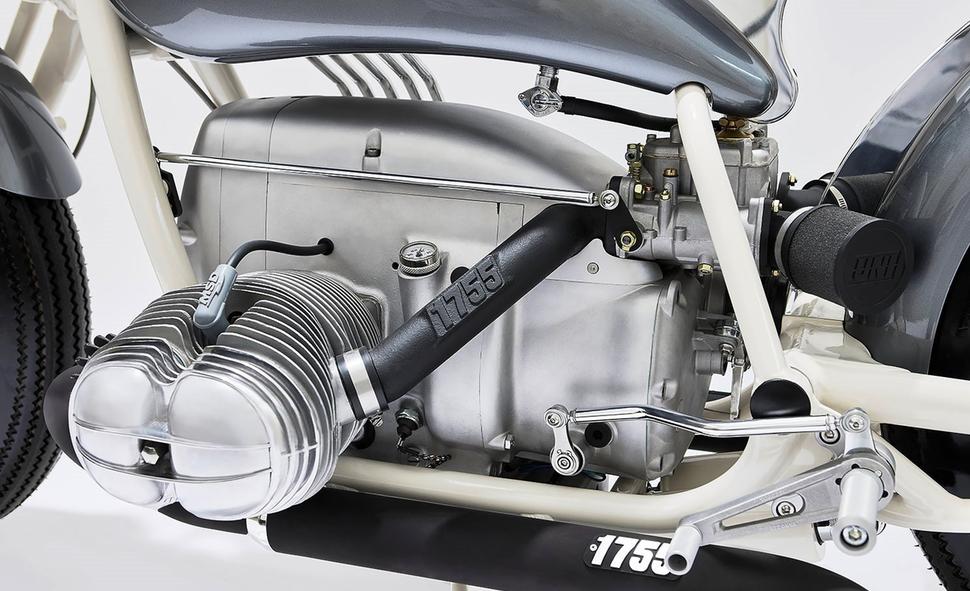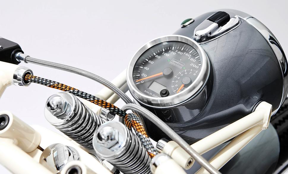 Идея Джонни состояла в том, чтобы модернизировать некоторые аспекты BMW R 75/5, одновременно снабдив несколькими особенностями более старых мотоциклов. Ключевые нюансы стокового BMW - барабанные тормоза, карданный привод и культовая фара - сохранились как дань уважения к его происхождению.