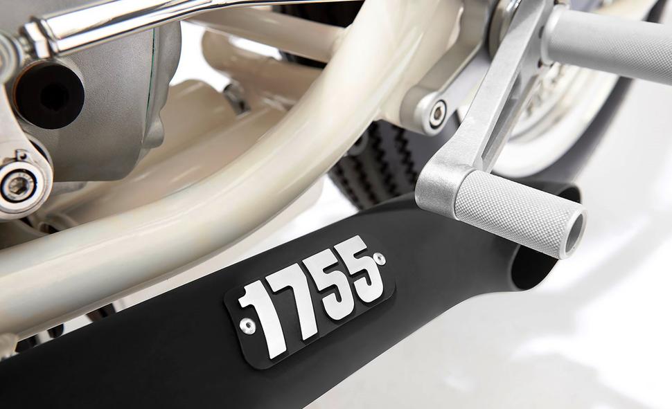 Завершает перечень кастомная выхлопная система, установленная как можно ближе к раме. Джонни втиснул её так плотно, что ему пришлось сделать выборки в задней части каждого глушителя, чтобы освободить место для болтов крепления мотора. Алюминиевый значок, изготовленный на ЧПУ-шном фрезере, украшает каждую банку.
