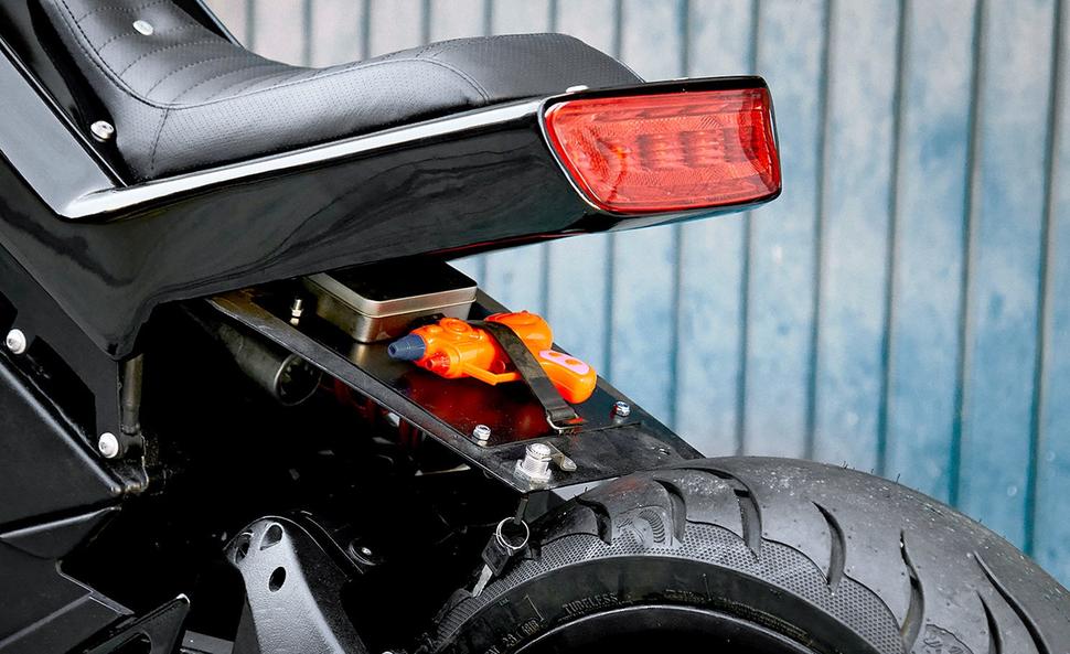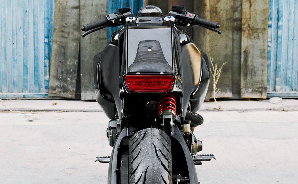 Всё построено вокруг штатного аирбокса и отсека с электрикой, причём Давид позаботился о том, чтобы к ним остался удобный доступ. Пара массивных боковых обтекателей ручной работы заменила изогнутые элементы, когда-то украшавшие переднюю часть мотоцикла.