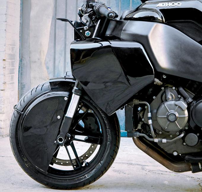 Рама, одновременно являющаяся резервуаром для топлива - настоящее благо, позволившее Давиду избежать хлопот с созданием нового бензобака для Buell 1125CR. Вместо этого он сосредоточил усилия на изготовлении нового цельного обвеса-монокока, который заменит штатный фальшбак и сиденье. Новая облицовка соответствует кубистической эстетике, которой знамениты мотоциклы Ad Hoc, и одновременно дополняет характерный силуэт шасси Buell.