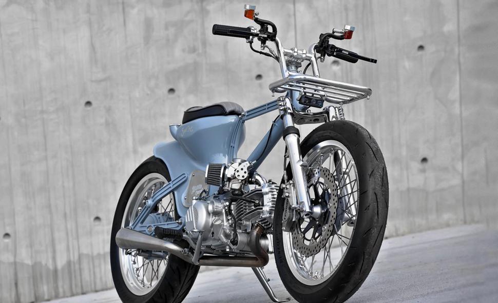 Обвес Honda Cub был слегка переделан: врезана новая заливная горловина топливного бака, чтобы не приходилось открывать сиденья для заправки. Батарея теперь находится за полированным алюминиевым боковым кожухом, а замок зажигания - на противоположной стороне.