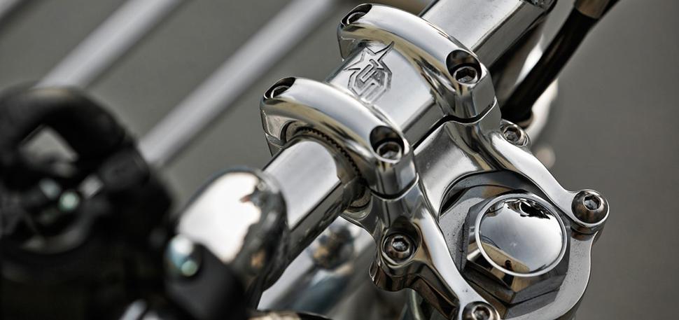 Руль - это вообще отдельное произведение искусства: 2LOUD сделали его с нуля, и если приглядитесь - вы поймёте, что он плавно переходит в передний багажник. Он, конечно, не предназначен для перевозки тяжестей, но владелец - любитель шашлычка, и на этом багажнике возит принадлежности для него.