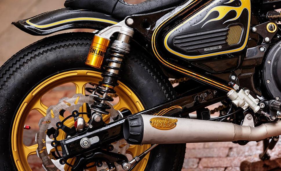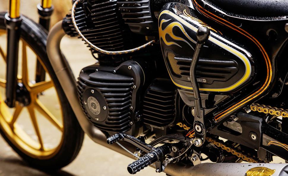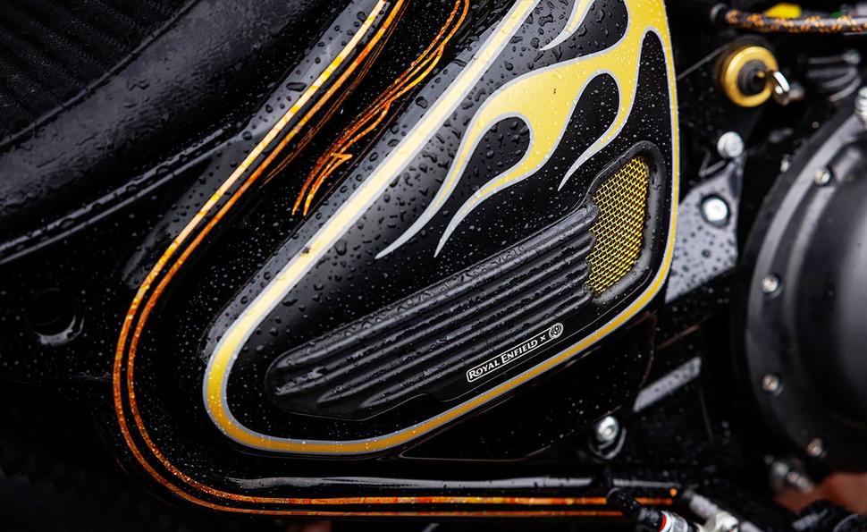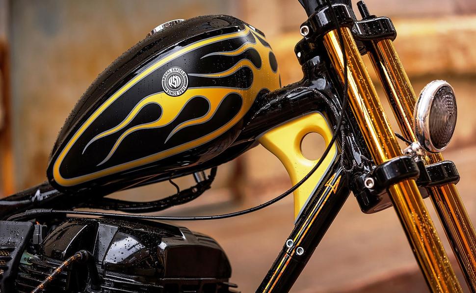 Весьма радикальный дизайн для среднекубатурного круизёра Royal Enfield, и ещё более смелым его делает эффектная чёрно-золотая расцветка. В центре внимания - золотые языки пламени, обрамлённые серебряными окантовками. А при внимательном рассмотрении откроются и другие детали из золотой потали (фольги).