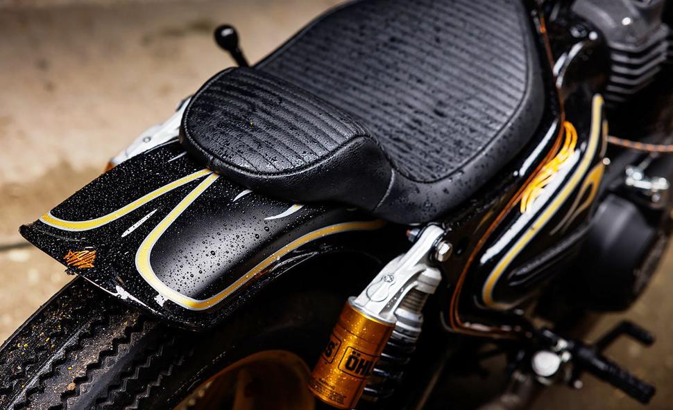 Над колесом гордо реет кастомное крыло, оставляя достаточно пространства для того типа езды, который предпочитает Роланд Сэндз. На крыле установлено тонкое сиденье с поперечной прострочкой, а крохотный задний фонарь крепится к нижнему креплению правого амортизатора.