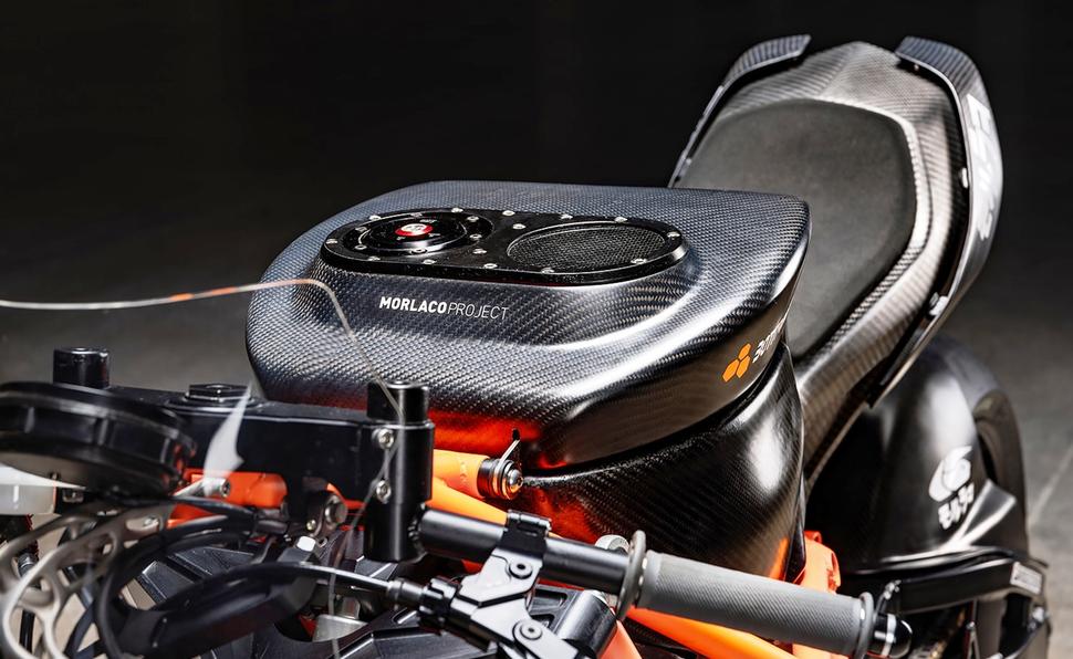 Под слоями карбонового композита скрывается топливный "пузырь", созданный для этого проекта из композитных материалов компанией Pyrotect из США. Топливная ячейка создана по тому же принципу, что и бензобаки гоночных автомобилей - она способна выдерживать сильные удары и даже возгорание. Кожух бака, воздушный короб, воздухозаборники и колёсные крылья были напечатаны на 3D-принтере испанской командой Optimus3D, а затем покрыты карбоном для прочности.