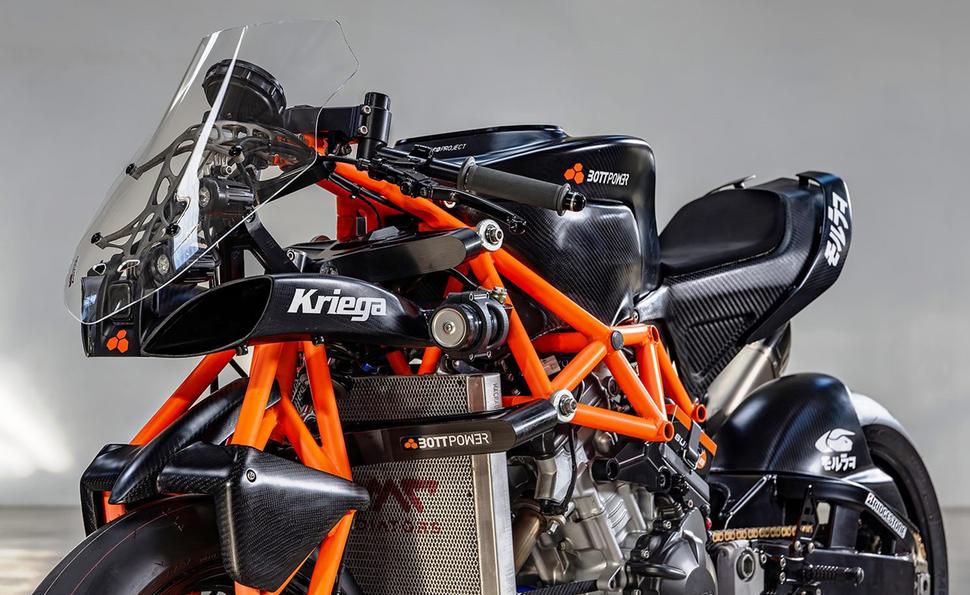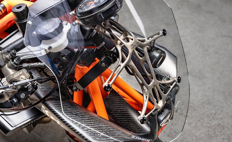 А спереди небольшой ветровик крепится к напечатанному на 3D-принтере титановому кронштейну. Его внешний вид дисгармонирует остальному дизайну мотоцикла, но это не случайность. Bottpower спроектировали его в цифровом формате при помощи оптимизации топологии - математического метода, оптимизирующего распределение материалов, основываясь на таких факторах, как имеющееся пространство и возможные нагрузки на тот или иной участок детали.