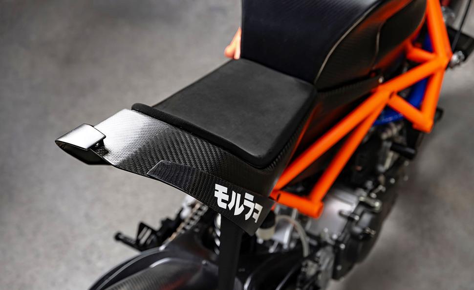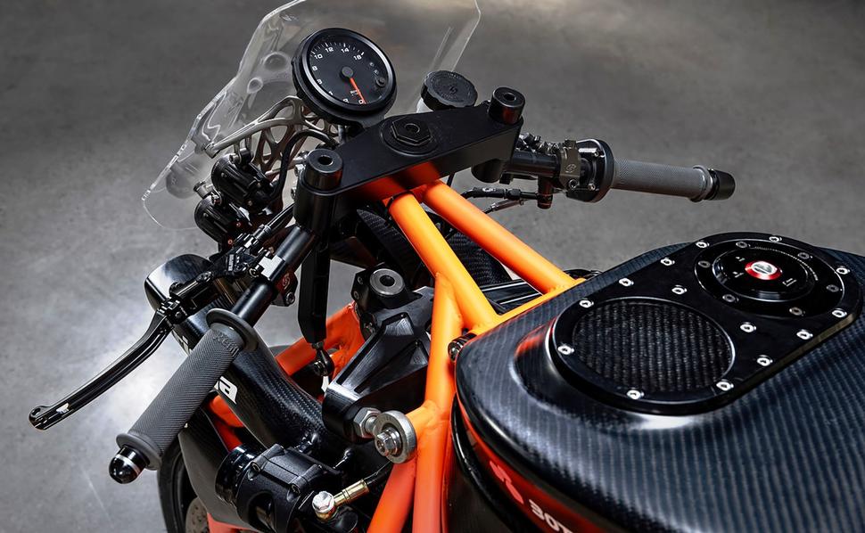 Огромная работа была проделана и над мелочами, которых не видно. Например, мотоцикл получил полностью новую электросистему с системой сбора данных. Небольшая литий-ионная батарея расположена сбоку мотоцикла, прямо рядом со стартером, чтобы исключить избыточную длину силовых проводов. В кастомном корпусе аккумулятора расположено также зажигание и кнопка запуска двигателя, и предохранители, конечно же. А больше никаких кнопок и нет: на клипонах стоят только грипсы да ручки тормоза и сцепления, плюс аналоговый тахометр.