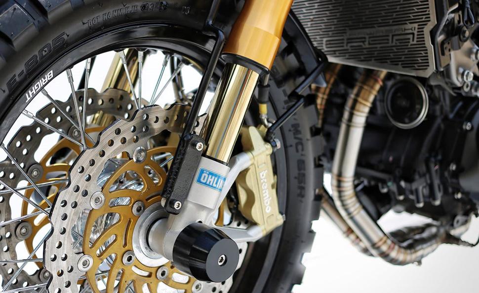 Для начала оригинальную вилку Kawasaki заменили на перевёрнутый Öhlins от Ducati, сменив клапана под этот проект. Туда же была установлена пара суппортов Brembo на новых дисках от Sunstar. Задний диск тоже оснастили суппортом Brembo.