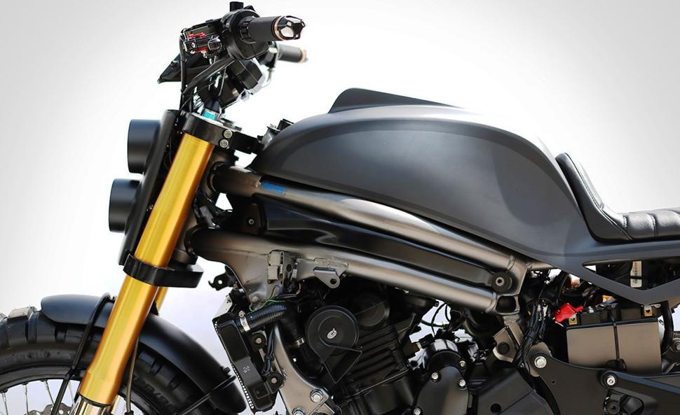 Но главное - конечно, визуальные изменения Kawasaki ER 6n. Studio Motor сняли весь обвес Kawasaki - вплоть до мелочей типа нижнего спойлера и небольших декоративных элементов рамы. Затем команда металлообработчиков изготовила монококовый бак-хвост из алюминия. К нему прилажено тонкое фактурное сиденье, а диодный свет аккуратно встроен в заднюю часть монокока. Всё это крепится на кастомном подрамнике, а аккумулятор и электрика прячутся под ним.