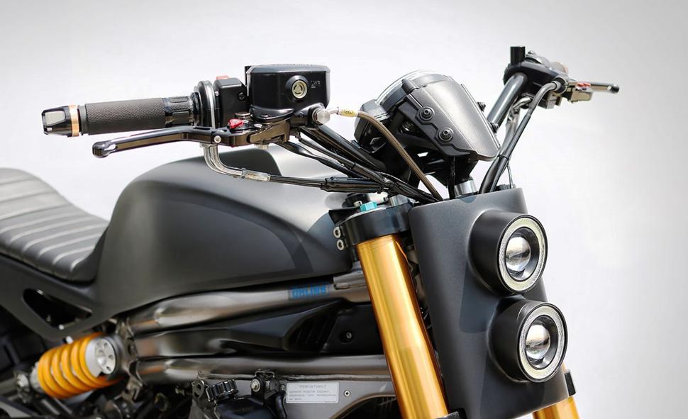 Спереди - ещё один кастомный элемент: двойная диодная фара, выполненная в стиле трекерной номерной таблички и крепящаяся к вилке.