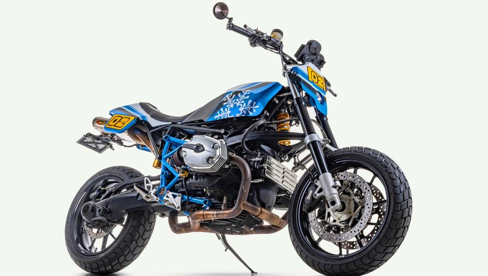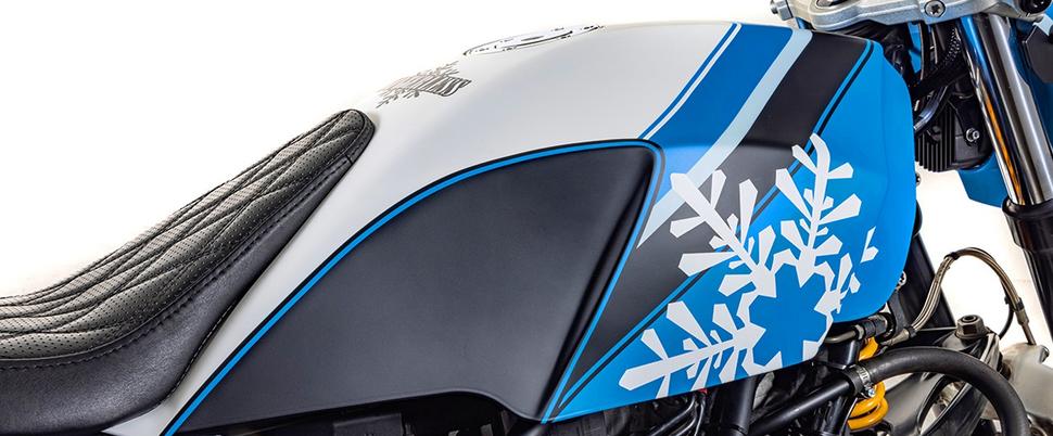 В шикарной окраске сочетаются классическая спортивная ливрея BMW - голубая с белым и чёрным - и шикарные снежинки по бокам бака, эффектные и яркие. В стране, где даже кастомайзеры взяли себе имя Winterless, то есть лишённые зимы, снежинка - это почти недосягаемая и романтичная экзотика.