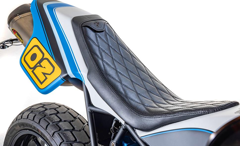 При желании восстановить старый стиль можно довольно легко вернуть оригинальный бак - рама в этом месте осталась нетронутой. А вот в остальных местах - напротив: новый хвост установлен на новый же подрамник, а чёрное кожаное сиденье в ромбик заходит на бак. Аккуратный задний фонарь, спрятанный в хвосте - от R nineT.