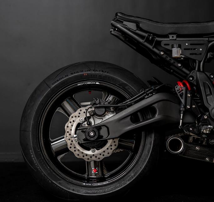 Лёгкие как пёрышко карбоновые 17-дюймовые колёса Rotobox RBX2 весят почти вдвое меньше типичных спортбайковских колёс. Они обуты в Pirelli Diablo Super Corsa, причём заднее имеет ширину 180 против обычной 160.