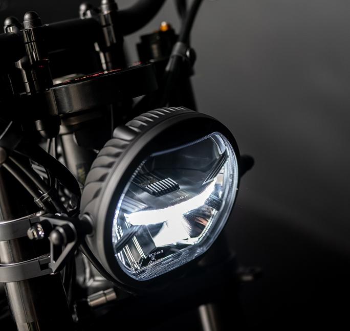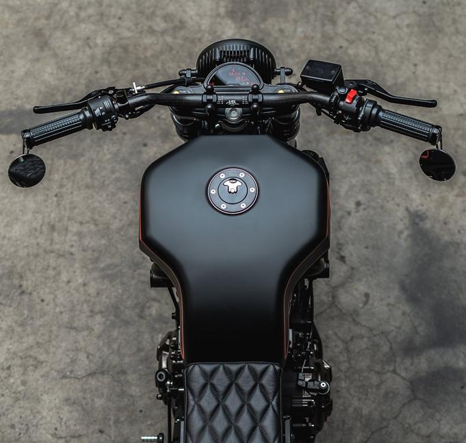 Удивительно, но в процессе не потребовались ни сварочный аппарат, ни болгарка. Вместо этого команда Ironwood установила на него целиком переднюю часть Yamaha YZF-R1, включая тормоза, что должно повысить управляемость до нового уровня. Попутно мотоцикл обзавёлся кастомной траверсой, в которую встроен цифровой спидометр Motogadget Motoscope Pro. Грипсы, зеркала в торцы руля и передние поворотник m.blaze pin тоже произведены Motogadget, а чуть впереди карбонового руля LSL находится диодная фара Koso Thunderbolt.