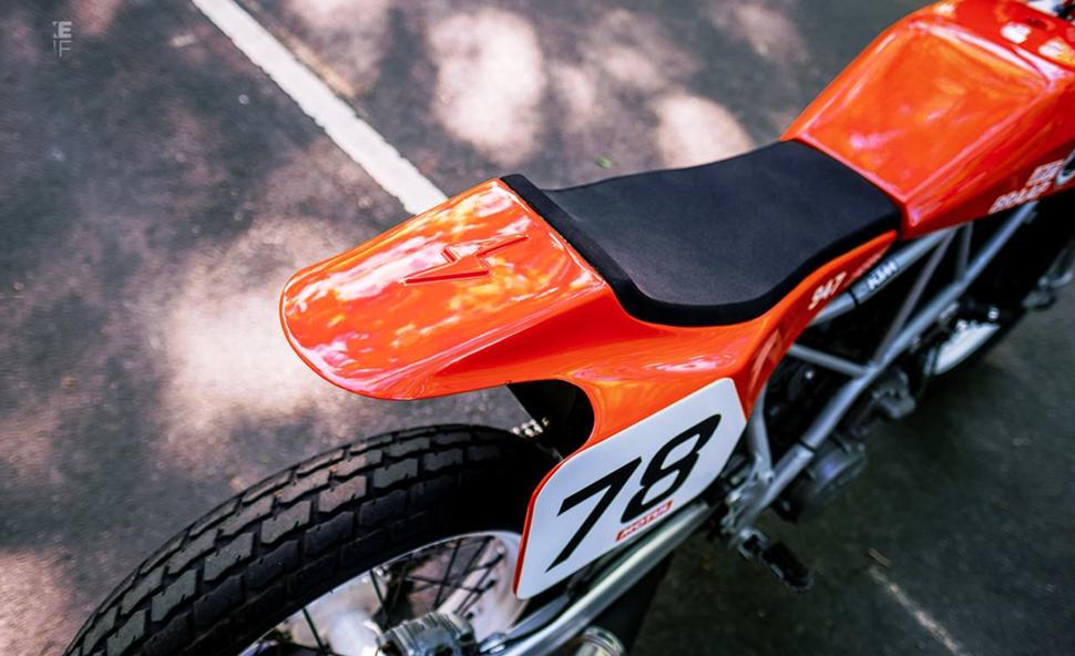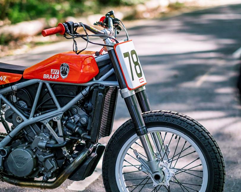 Кропотливая работа была проведена и над передней частью KTM 950 Supermoto. Зажигание расположилось спереди фальшбака при помощи кастомного крепления. Спереди находится алюминиевая номерная табличка, сделанная в том же стиле, что и остальные флэт-трекеры Уве.