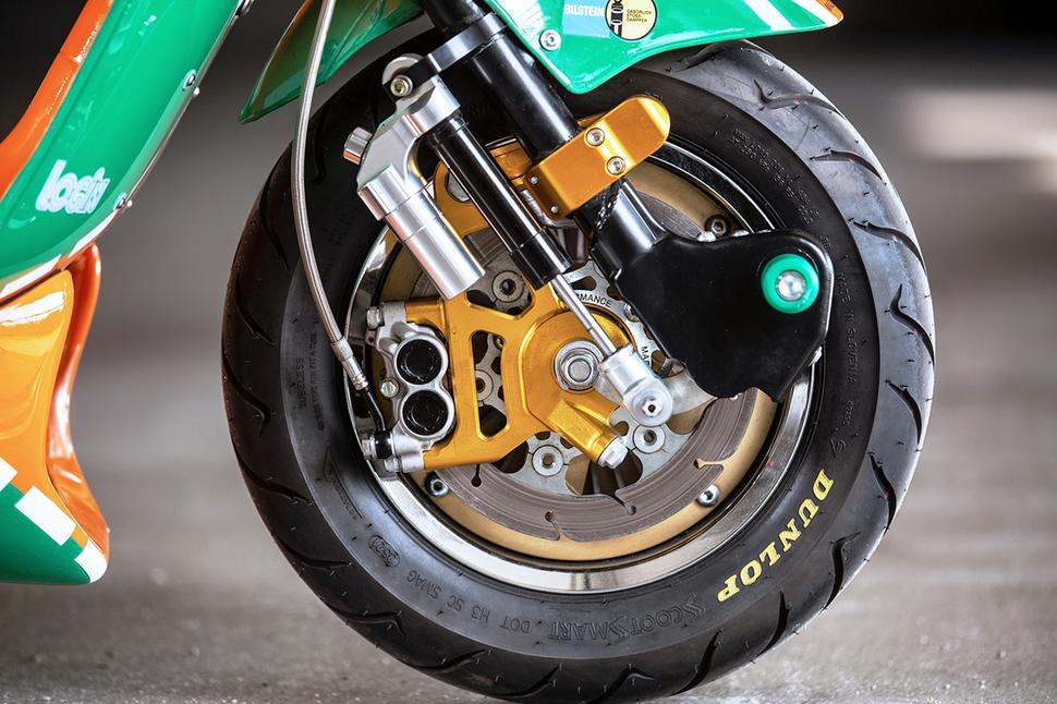 Шасси Mazda Vespa не менее хитроумное. Спереди установлена вилка от Lambretta с двумя амортизаторами, оснащённая множеством фрезерованных зажимов с анодированной поверхностью. Тормозная система - весьма внушительная: большой передний диск от Casa Performance с четырёхпоршневым суппортом на нём, а на другой стороне кастомного многокомпонентного колёсного диска расположена заглушка, вдохновлённая оригинальной 787B. Сзади стоит амортизатор YSS с кастомной нижней частью, а фрезерованная тормозная педаль приводит в действие главный цилиндр от ZX6R.