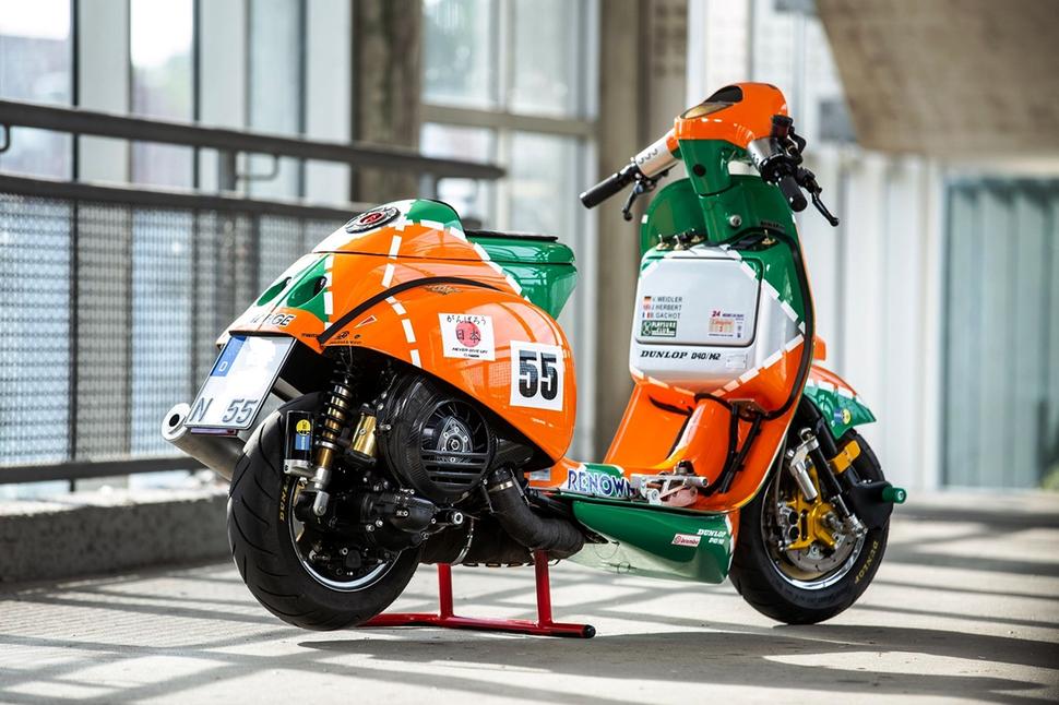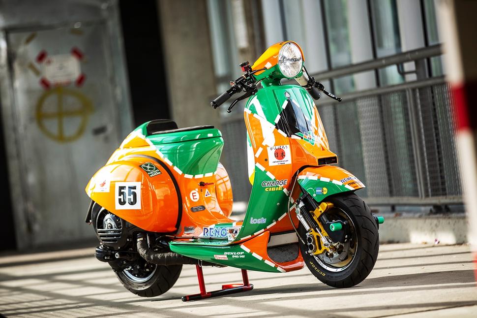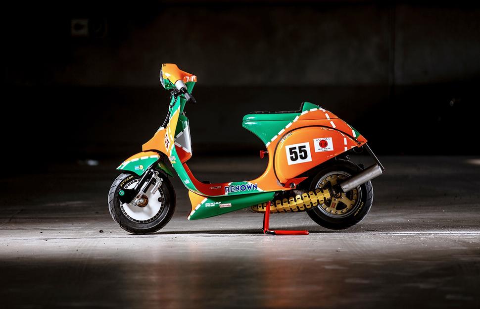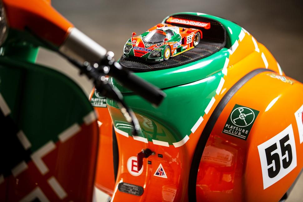 Именно поэтому на этой Vespa нет привычных полос Martini или Gulf, а вместо этого её окраска - одна сплошная отсылка к оранжево-зелёной 787B, вплоть до тщательно воссозданной наклейки о техническом осмотре 91 года и изящного логотипа с роторным двигателем на ступице вентилятора.