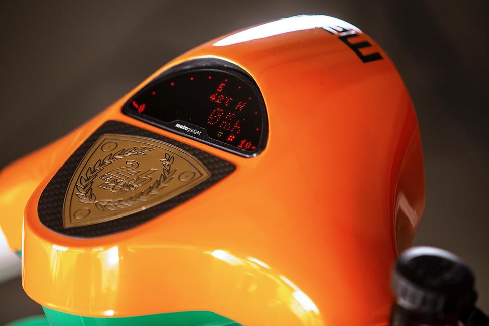 Эргономика и посадка - дань уважения минимализму гонок на выносливость. Полнофункциональная приборка Motogadget установлена в напечатанном на 3D-принтере корпусе, по бокам от которого расположены пульты с исторически достоверными маркировками: Start, Kill и Fuel. Каждый переключатель на руле подсвечивается своим цветом благодаря встроенным светодиодам. Облицовка руля имеет новую форму, открывающую главный цилиндр, грипсы на руле - от Rizoma, ручка газа - от Domino, и всё выглядит продуманным, долговечным и тактильным.