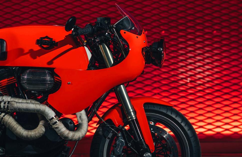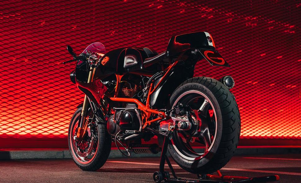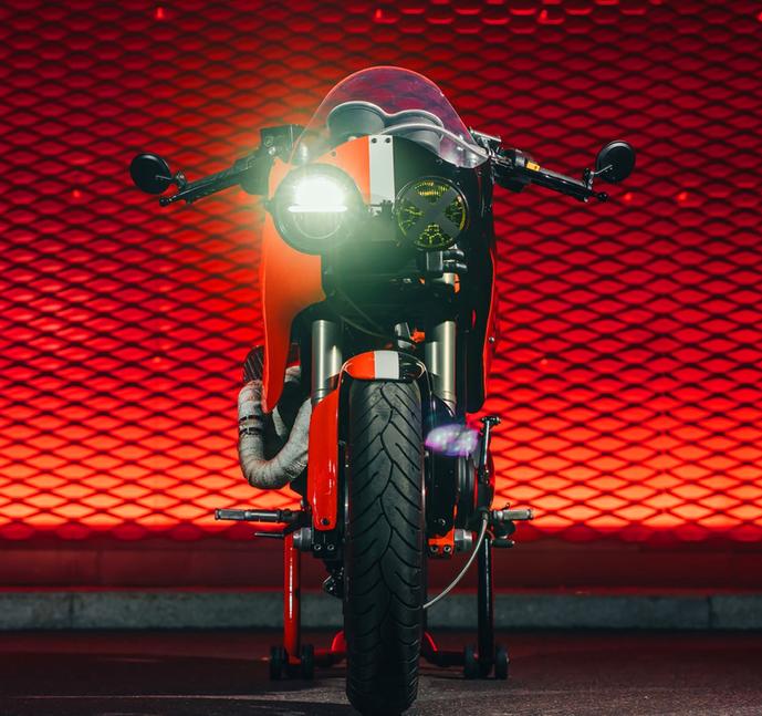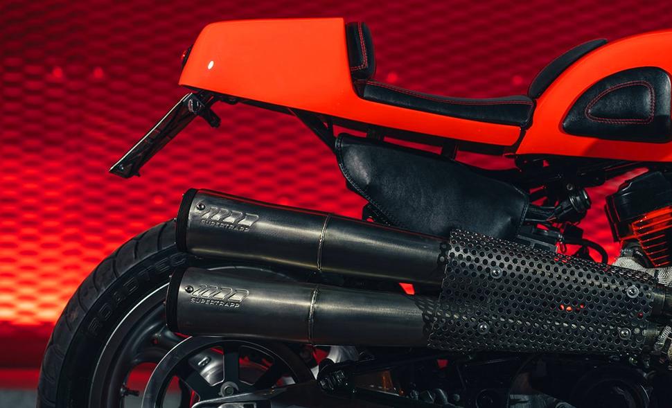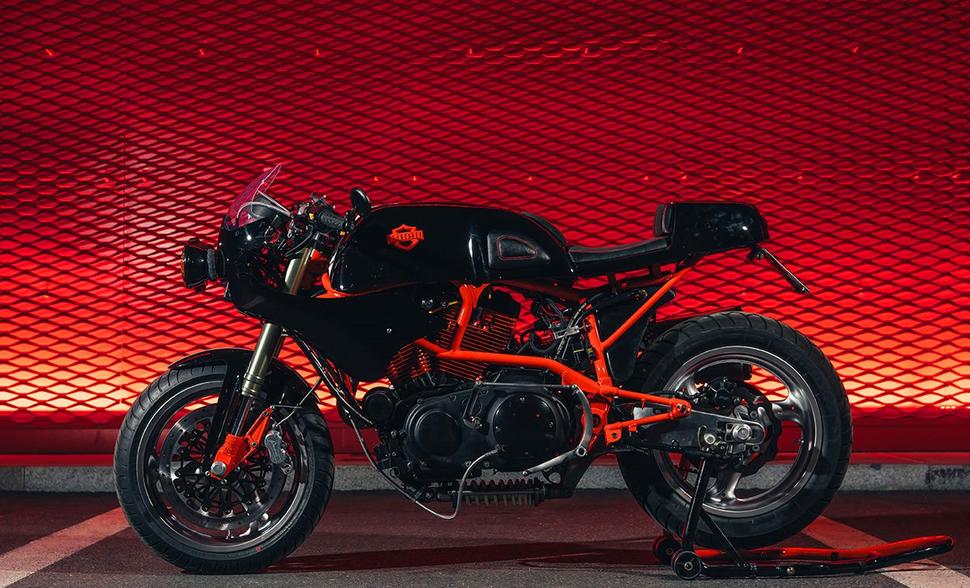 Когда донор прибыл в миланскую мастерскую, Джакомо приступил к созданию классического кафе-рейсера на базе Harley, вот только с разных сторон он выглядит по-разному. С одной стороны всё окрашено в чёрный, а с другой - в традиционный Харлеевский гоночный оранжевый, от двигателя и рамы вплоть до тормозных суппортов и подката.