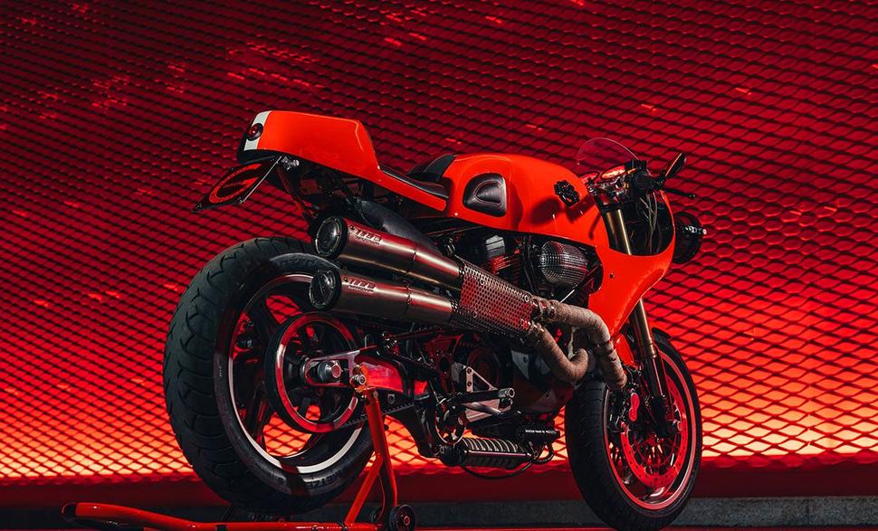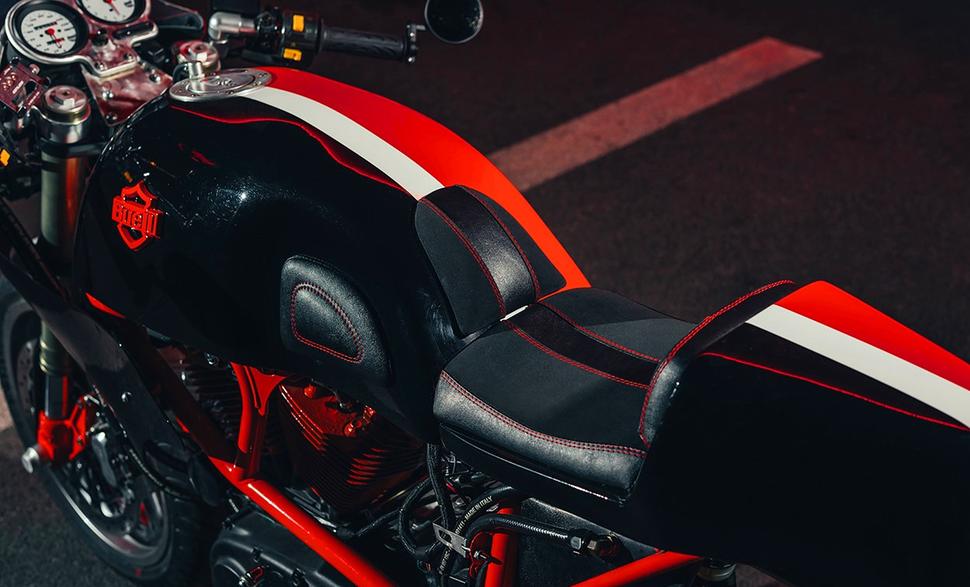 То, что выглядит как бензобак - на самом деле фиберглассовый кожух поверх настоящего бака, позаимствованный с Ducati 750 SuperSport образца 1980-х. Его задней части были приданы чуть более плавные линии, а по бокам приклеены напечатанные на 3D-принтере значки, объединяющие логотипы Harley и Buell. Хвост тоже фиберглассовый, по слепкам с мотоциклов для гонок на выносливость, а кожаное седло, украшающее его, было разработано L.R. Leather Goods.